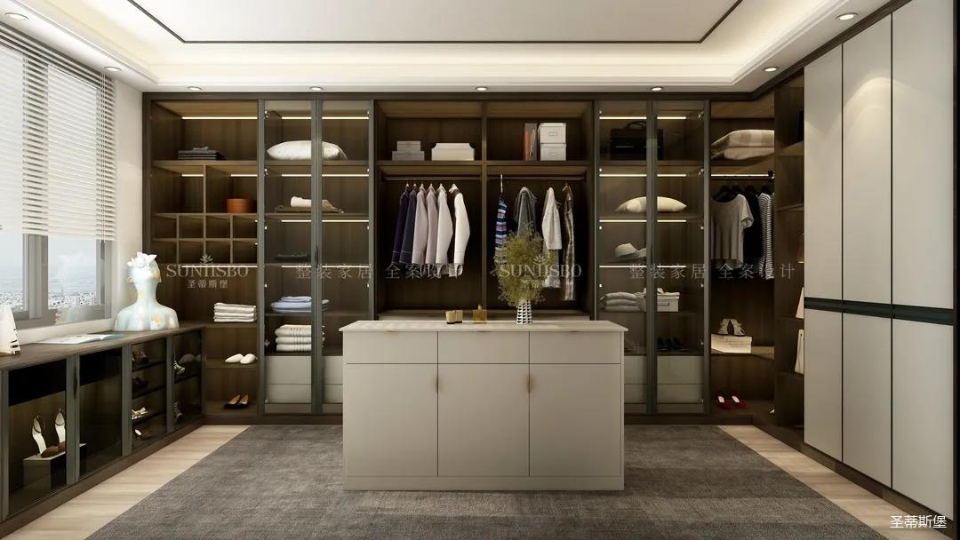衣帽间采用了虚实结合的设计,构筑起规整而有序的置物区域和功能齐全的收纳系统,烟熏色实木作为空间的主要元素,环抱着整个衣帽间,张扬又不失沉稳,恰到好处地搭配金属玻璃置顶高门和感应灯光系统,挑高了空间效果,也诠释着现代极简线条美感和对极致的生活追求。