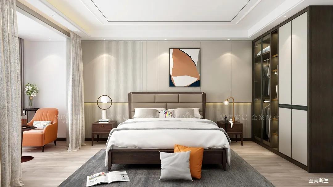 次卧的对称极简主义让人拥有奢华、简约居家质感。倒梯形的几何床头柜和奢华的水母造型床头灯,都让空间散发着华贵的魅力。嵌入式的立面衣橱,运用不同的材质将极简的协调效果达到极致,收纳空间层层分区,让每一件物品都有迹可循。